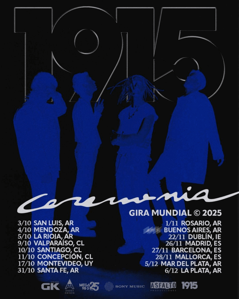 La banda argentina 1915 estrena Ceremonia, su quinto trabajo de estudio ya disponible en todas las plataformas digitales. Se trata de un álbum conceptual de ocho canciones —cada una con su video— que exploran el recorrido del individuo hacia lo colectivo, en tiempos marcados por la soledad hiperconectada y la búsqueda de pertenencia.