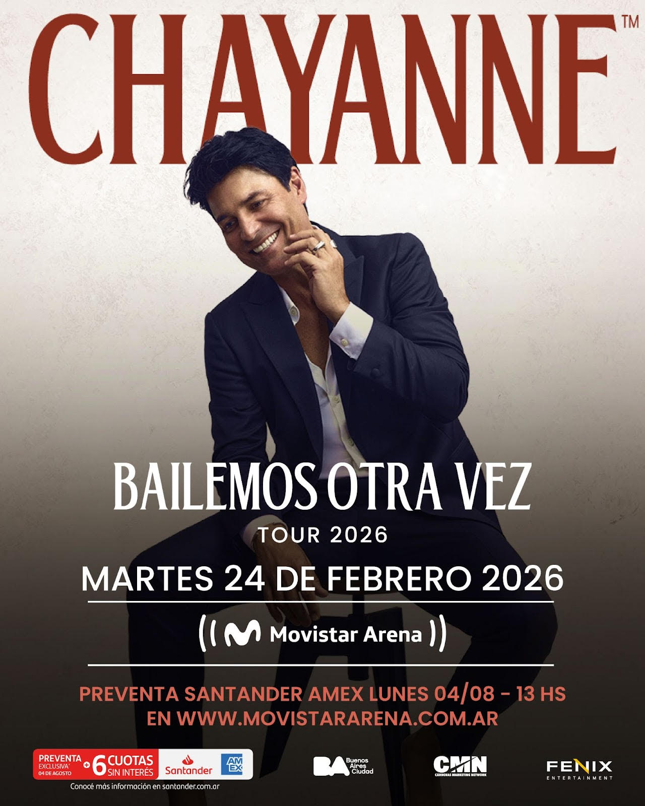 Después de más de cinco años de espera, Chayanne regresa a la Argentina con su espectáculo más esperado. El 24 de febrero de 2026, el ícono de la música latina se presentará en el Movistar Arena de Buenos Aires como parte de su gira internacional “Bailemos Otra Vez Tour”, con producción de Fenix Entertainment y CMN.