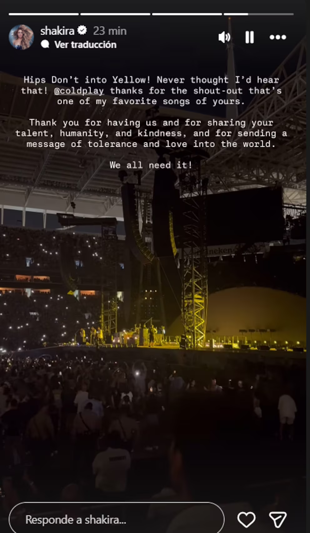 Shakira no tardó en expresar su gratitud a través de Instagram, donde publicó una historia agradeciendo a Chris Martin por “su talento, humanidad y bondad”, y por “enviar un mensaje de tolerancia y amor hacia el mundo”. La cantante también dejó en claro lo especial que fue ese momento para ella y su familia.