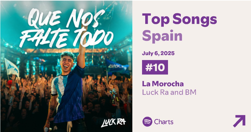 Luck Ra está viviendo el momento más explosivo de su carrera. Su hit “La Morocha”, junto a BM, no solo fue un éxito arrasador en Argentina, sino que también conquistó España, donde se mantiene en el Top 10 de Spotify hace más de 200 días. Esta hazaña lo ubica como uno de los artistas más escuchados del país, marcando un hito para la música urbana argentina en el exterior.