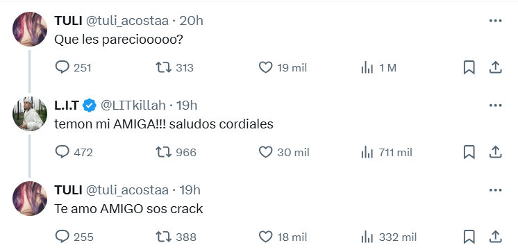 Tuli y LIT killah comenzaron su historia en 2022, luego de conocerse por amigos en común. En ese entonces, la bailarina estaba en una relación con el streamer Oky. Los fans fueron quienes descubrieron el romance gracias a coincidencias en sus publicaciones y atuendos.